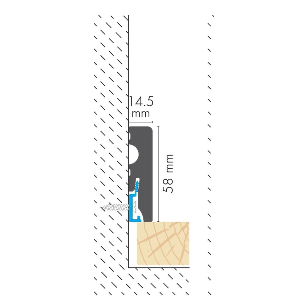 Balta MDF grindjuostės 5,8 cm aukščio (58 × 14,5 × 2200 mm) – praktiškas ir estetiškas sprendimas tvarkingam grindų ir sienų sandūros užbaigimui.